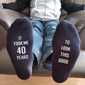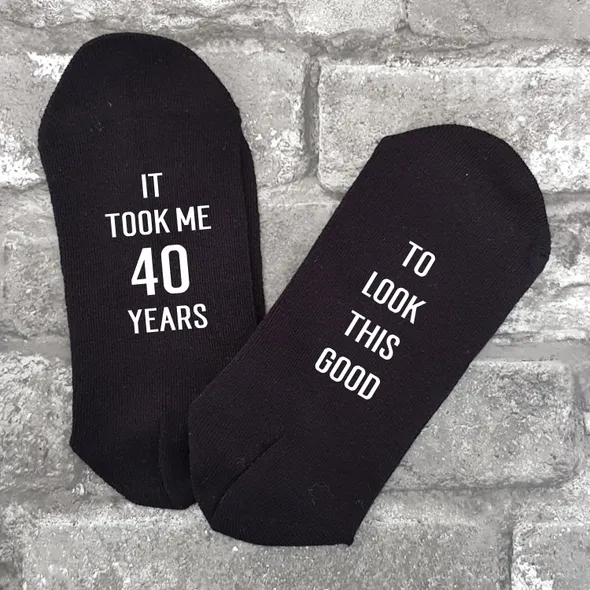 Novelty socks.Great humorous gift, perfect for a novelty 40th birthday. Give someone the socks they never knew they needed! These socks are available in men's or woman's sizes and as trainer or normal socks. All of my items are made using high quality heat transfer vinyl with an industrial heat press. PLEASE NOTE: THESE ARE NOT THICK SPORTS SOCKS, THEY ARE THE THINNER DRESS SOCKS.Washing:Please wash at 40° or lower with similar colours. Ironing:Please iron inside out. Do not iron design.Colours may appear different due to monitors/screen.Please ensure you have purchased the correct size and style before ordering. All our items are made to order. <<<<<< Please remember we are UK based & as such may be in a different time zone to you, so please be aware that there may be a delay in response to conversations. >>>>>>****************************************************************************************************************************************************************<<<<<< Shipping Information >>>>>>We are UK based and ship most items by Royal MailUK: 2nd Class Royal Mail – following dispatch expect delivery within 2-5 days.UK UPGRADE TO 1st Class – following dispatch expect delivery within 1-2 daysEUROPE: Royal Mail International Standard - following dispatch expect delivery within 5-14 days. THIS SERVICE IS NOT TRACKED. EUROPEAN UPGRADE: Royal Mail International Tracked or Tracked and Signed - following dispatch expect delivery within 5-14 days.RUSSIA: Tracked or Tracked & Signed only.USA, AUSTRALIA & NEW ZEALAND: Royal Mail International Standard: IF YOU CHOOSE THIS OPTION IT IS NOT TRACKED – following dispatch expect delivery in 2-5 weeks (this may be longer during holiday periods).USA, AUSTRALIA & NEW ZEALAND UPGRADE: Royal Mail International Tracked - following dispatch expect delivery within 2-5 weeks.CANADA: Royal Mail International Tracked - following dispatch expect delivery within 2-5 weeks (this may be longer during holiday periods).Please note that we cannot be held responsible for any delays at Customs or otherwise due to Strikes, Weather Conditions or other unforeseen circumstances outside of our control.PLEASE NOTE that in all cases our Standard Shop Processing Times still apply *** If your order is Time Sensitive please let us know as soon as possible, ideally before making a purchase so that we can advise you accordingly if your need by date is achievable. ********************************************************************************************************************************************************************<<<<<< Delivery Information >>>>>>Any Items ordered by you will be delivered to the address that you supplied to Etsy. If any of the details in your delivery address that you gave us are incorrect, we are not liable for any items not received.You may request an address for delivery that is different to your billing address, if, for example, you would like us to deliver the items directly to a friend, a relative, or to your place of work.Delivery will be made as soon as possible, all delivery and dispatch timescales quoted do not include weekends or bank holidays.Some postal addresses in Northern Ireland, some offshore islands and some remote areas of Great Britain may not be covered by our normal delivery services and so we may have to contact you to advise you of extra postal charges.
