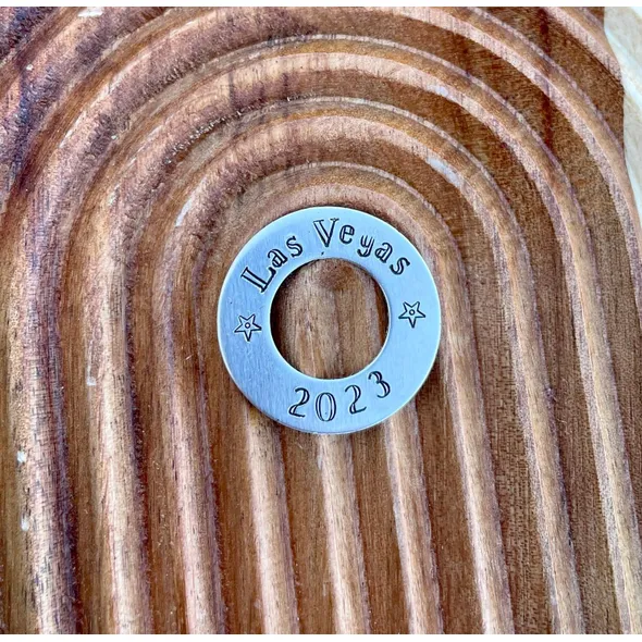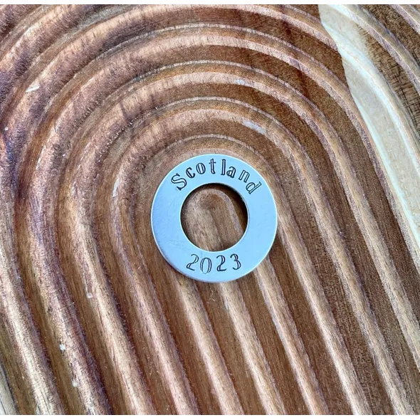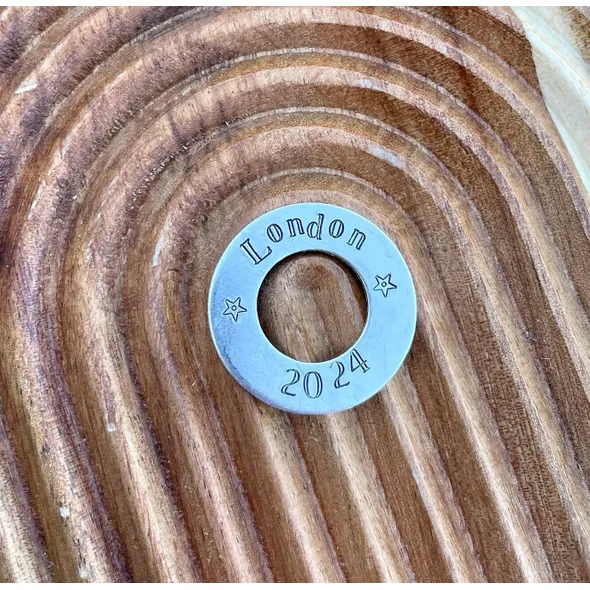Every item is hand stamped onto a 25mm aluminium washer, so natural variations will occur making a unique souvenir.